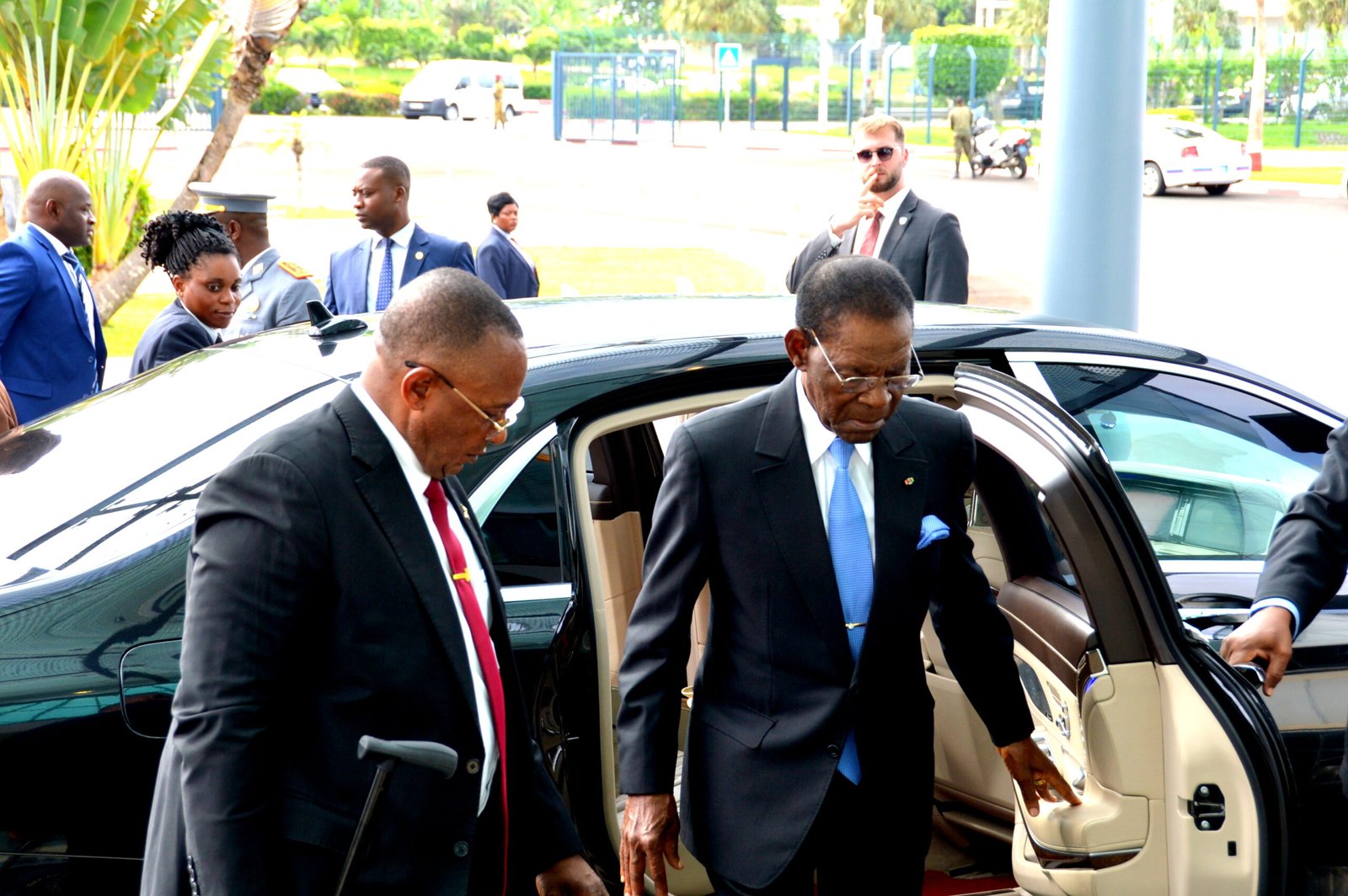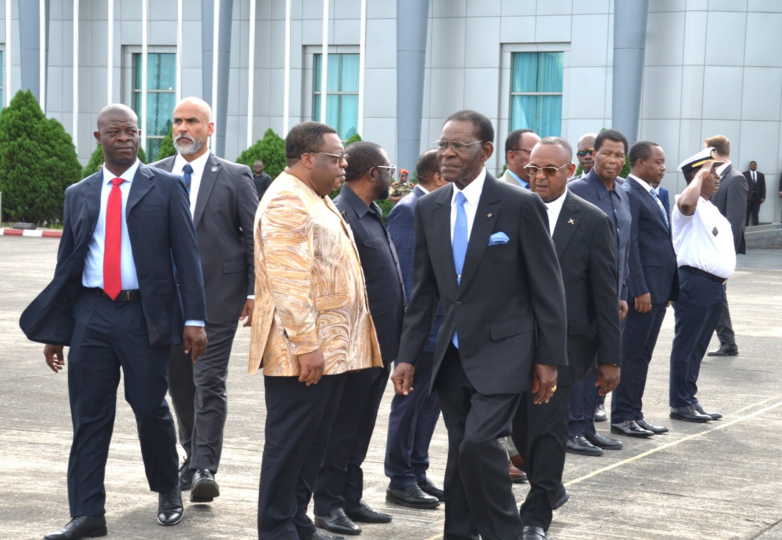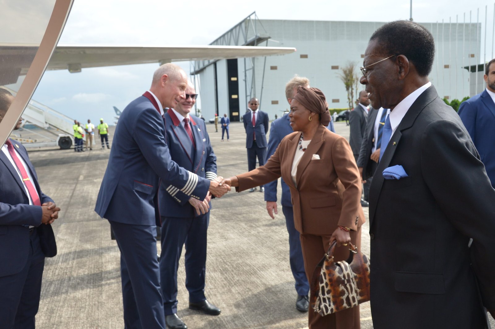 A su salida, la pareja presidencial fue despedida por una comitiva de los Ministerios de Defensa y Seguridad Nacional, encabezada por el Ministro de Estado para la Seguridad Nacional, Nicolás Obama Nchama, y el Ministro de Defensa, Victoriano Nsue Okomo, subrayando la importancia de la visita.